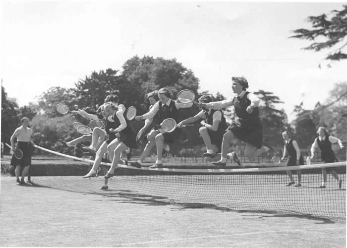 Taplow: (from l to r) Chris Barr holding racquet, Jean Milne standing, Prue Tatten on chair, Ann Sturgess sitting on floor